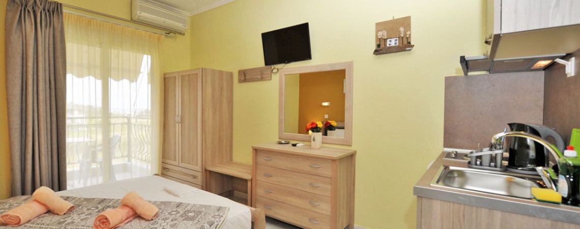 - Бр. 201 (двокреветно студио) на 2 кат. Страничен поглед кон море. Брачен – француски кревет во иста просторија со кујната.