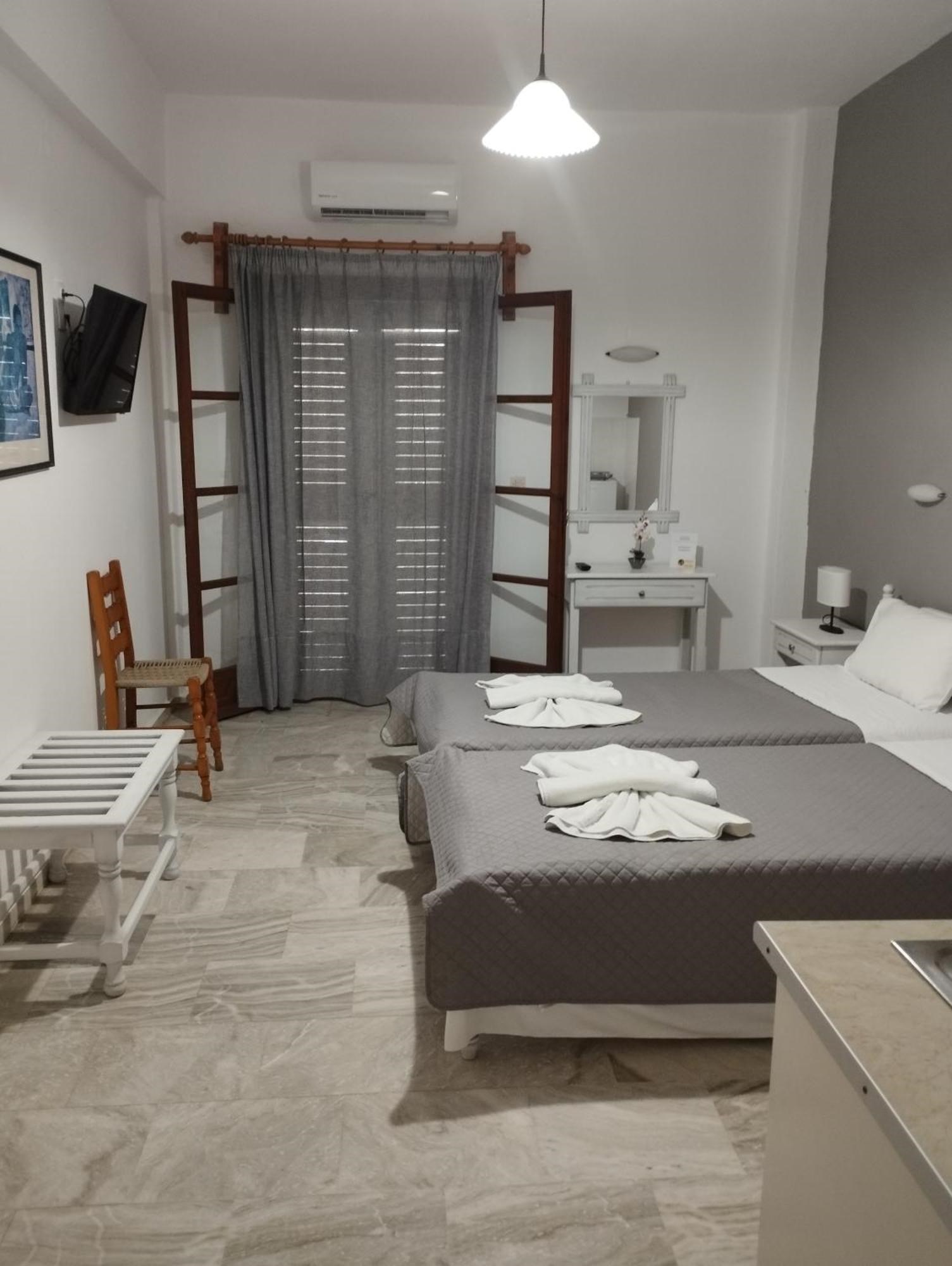 Собите се ново реновирани и целосно опремени. Имаат сопствена бања, кујна, фрижидер и клима уред. Вилата располага со двокреветни студиа со два единечни или еден брачен кревет.