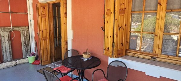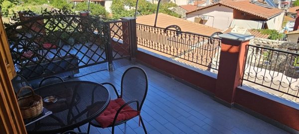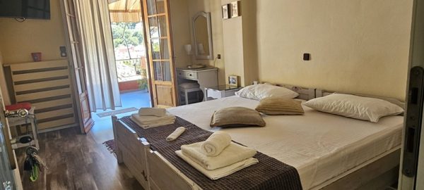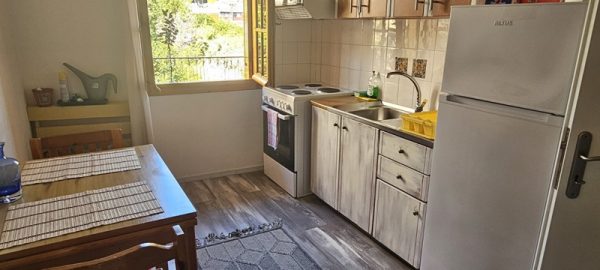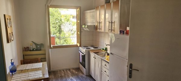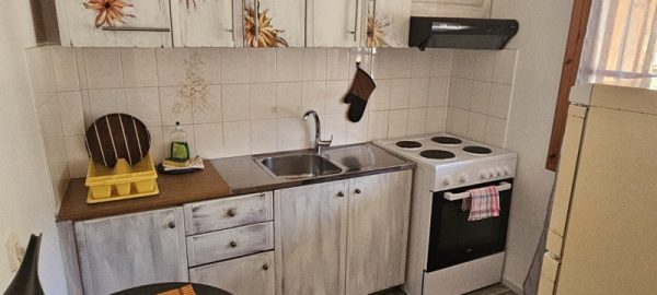 Апартманот се наоѓа на прв кат. Има еден дупол кревет (или може да бидат два поединечни) комотен за спиење на 2 лица и може да се додаде еден дополнителен кревет на спуштање за дете до 12 год. Има плакар за алишта,ТВ и клима уред. Кујната е во посебна просторија одвоена со ѕид, опремена со аспиратор, ел.шпорет, голем фрижидер со комора и комлетен кујнски инвентар. Има сопствено купатило и ВЦ. Апартманот излегува на тераса со маса и столици и прекрасен страничен поглед на море.