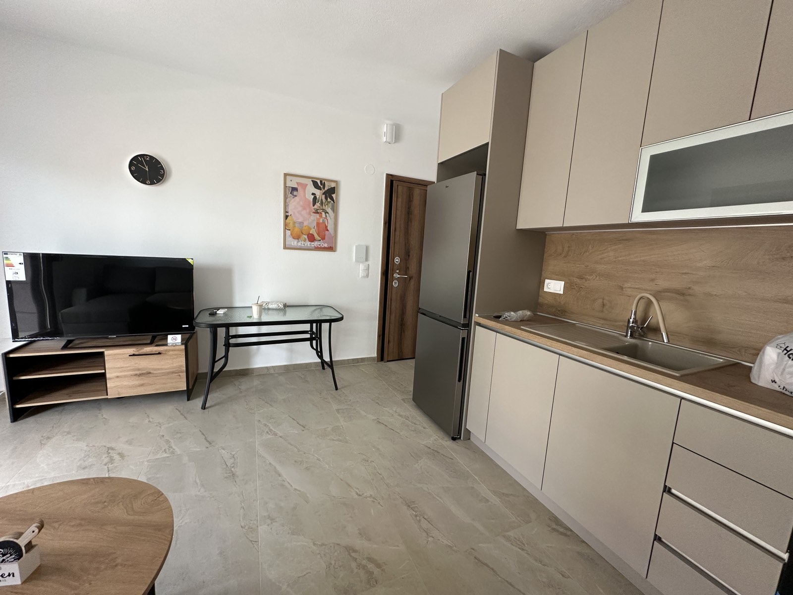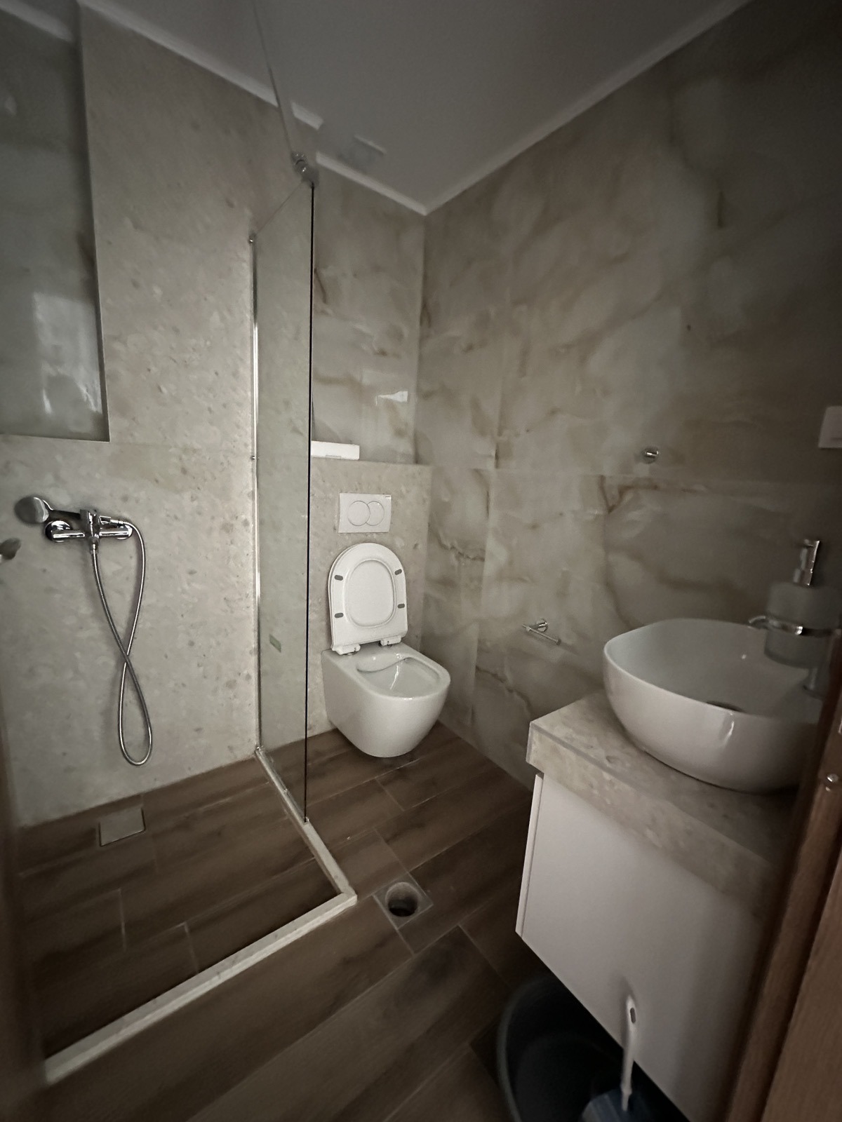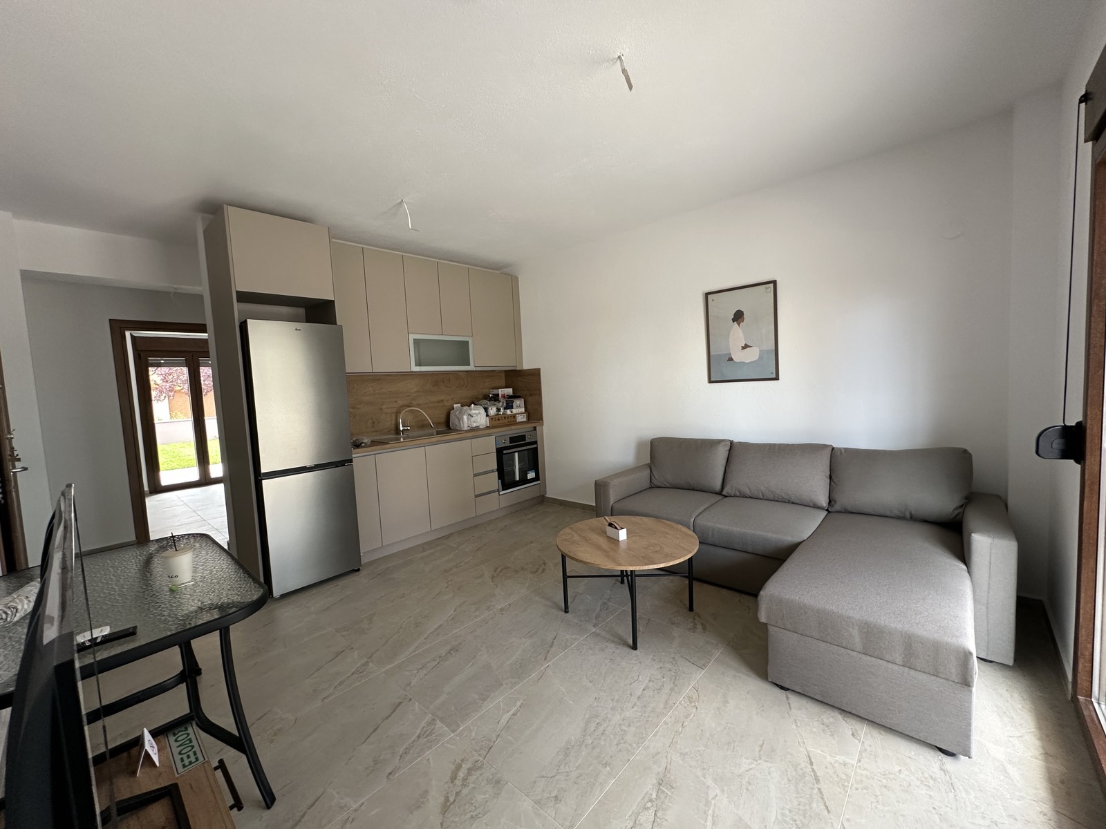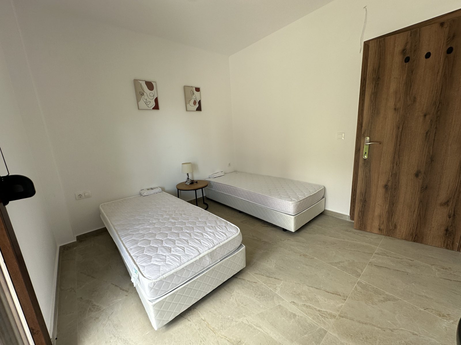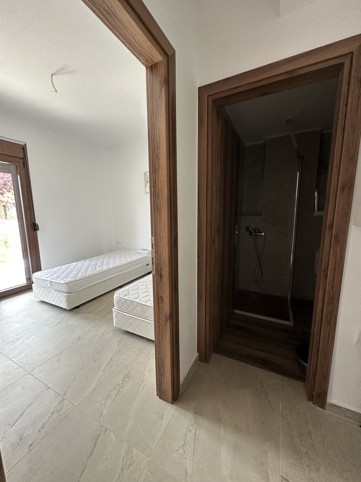 1/2+2 апартман бр. 1 – приземје. Простран апартман кој располага со голема спална соба опремена со два единечни кревети кои може да се спојат по желба од која се излегува на сопствена тераса со поглед кон дворот. Располага со пространа дневна соба со целосно опремена кујна со сите потребни елемнти (голем фрижидер, голем шпорет со рерна, кујнски прибор, аспиратор и сл.), ТВ и клима уред. Во дневниот простор има голема гарнитура на пуштање за 2 поголеми деца или еден возрасен и дете до 12 години. Од дневна соба се излегува на втората пространа тераса која има поглед кон улицата напред. Апартманот има сопствено ново купатило со туш кабина.