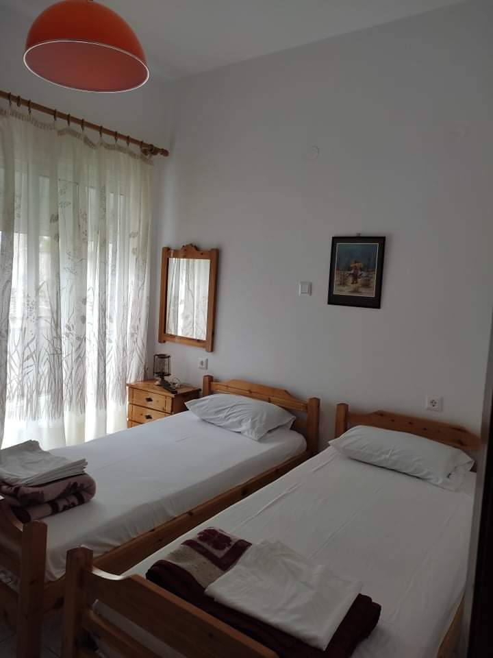 Сместување: Располага со апартмани за 3 и 4 лица. Четири апартмани се наоѓаат на високо приземје (бр.1, 2, 3, 4) и еден на прв спрат (бр.5). Се состојат од кујна каде има кревет на отварање или лежај со грчки димензи,голем фрижидер, шпорет БЕЗ рерна, основни садови за соодветниот број на лица , ТВ, интернет, купатило, клима, спална соба со брачен кревет или спална и единечен кревет, две тераси со поглед на улица и поглед на двор. Паркинг.